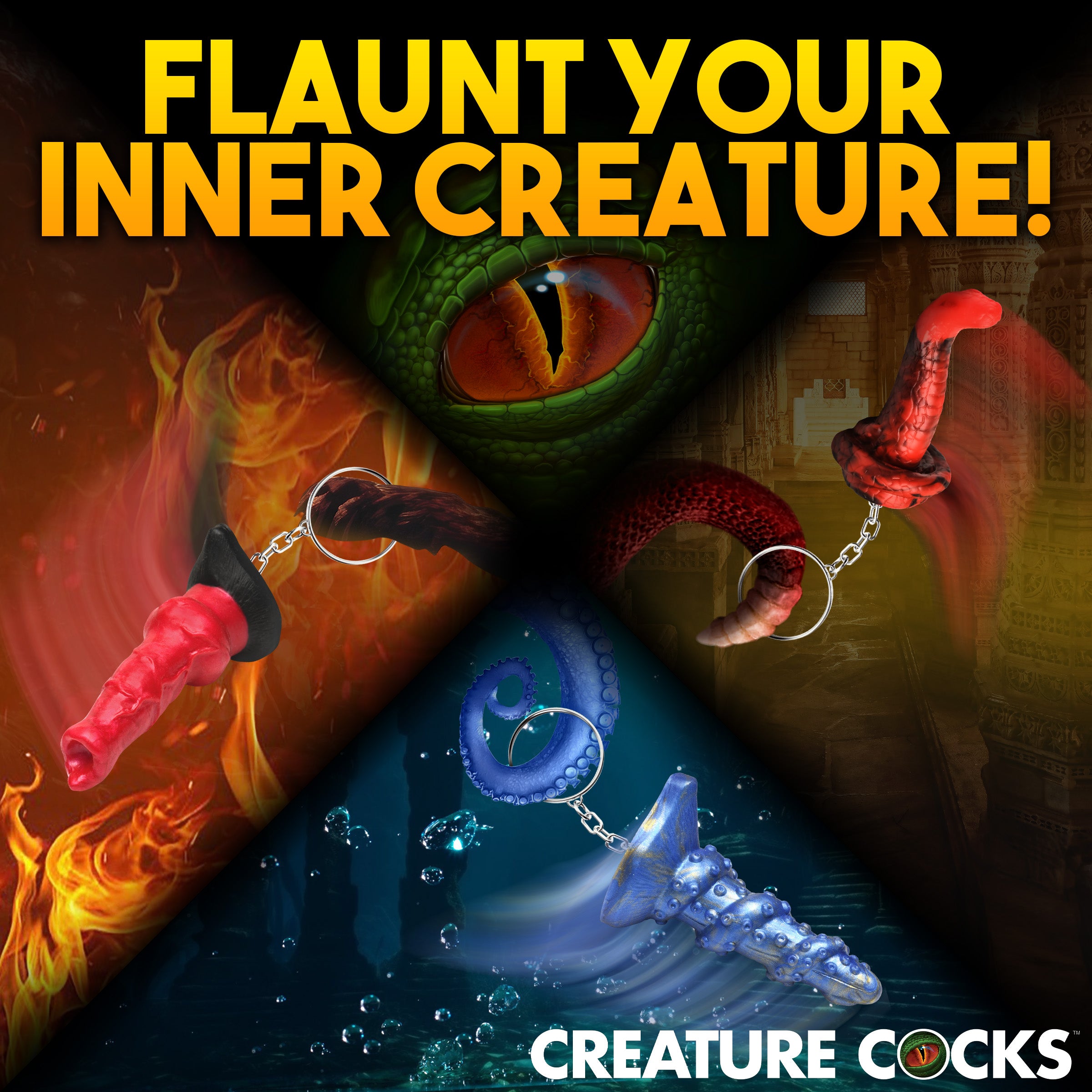 Let your adventurous side shine and proudly display your love for fantasy roleplay and mythical encounters with this captivating keychain set! Featuring three colorful and intricately designed miniaturized dildos - the Hell-Hound, Lord Kraken, and King Cobra - this set adds a touch of flair and kinky fun to your everyday accessories.
