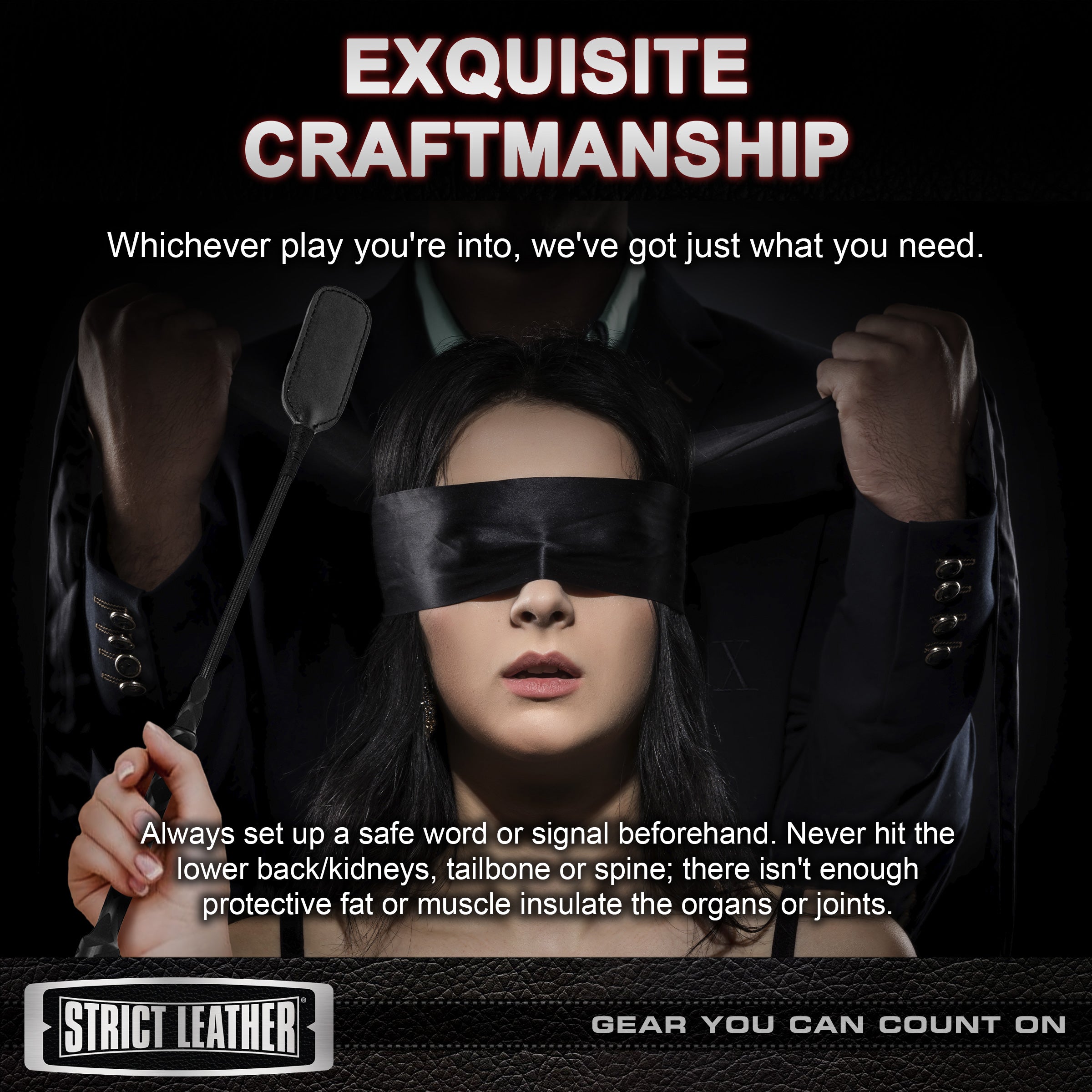 A good crop is an indispensable Dom staple. The classic design of this short riding crop is accented with attractive detailing on the rubber handle. Crisscrossed with elegant corset-style bands, the black contrast stripes enhance the visual appeal as well as your grip. The springy shaft is made of durable plastic covered with woven fabric. The genuine leather tip is a rounded paddle shape, bound in place with black thread.
