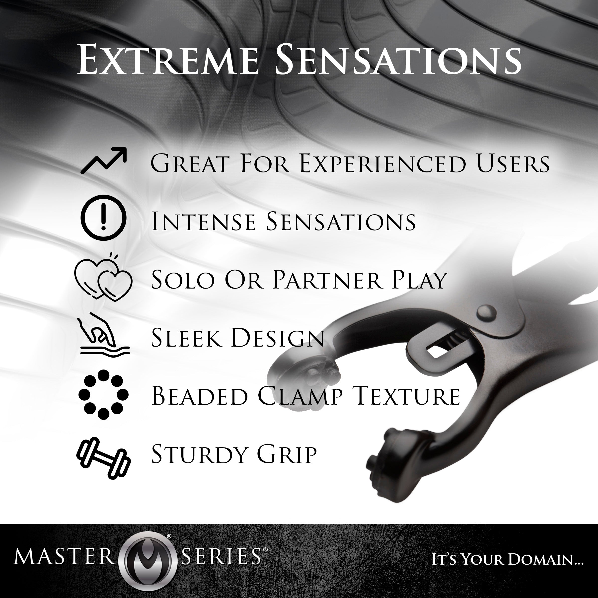A timeless classic. The Monarch Nipple Vice provides a light initial sensation...until the chain is pulled. They become increasingly harsh as more tension is added to the chain. The clover-style mechanism gives the Monarch a tight and unyielding grip on sensitive flesh. Ideal for solo play or with the one you want to dominate.