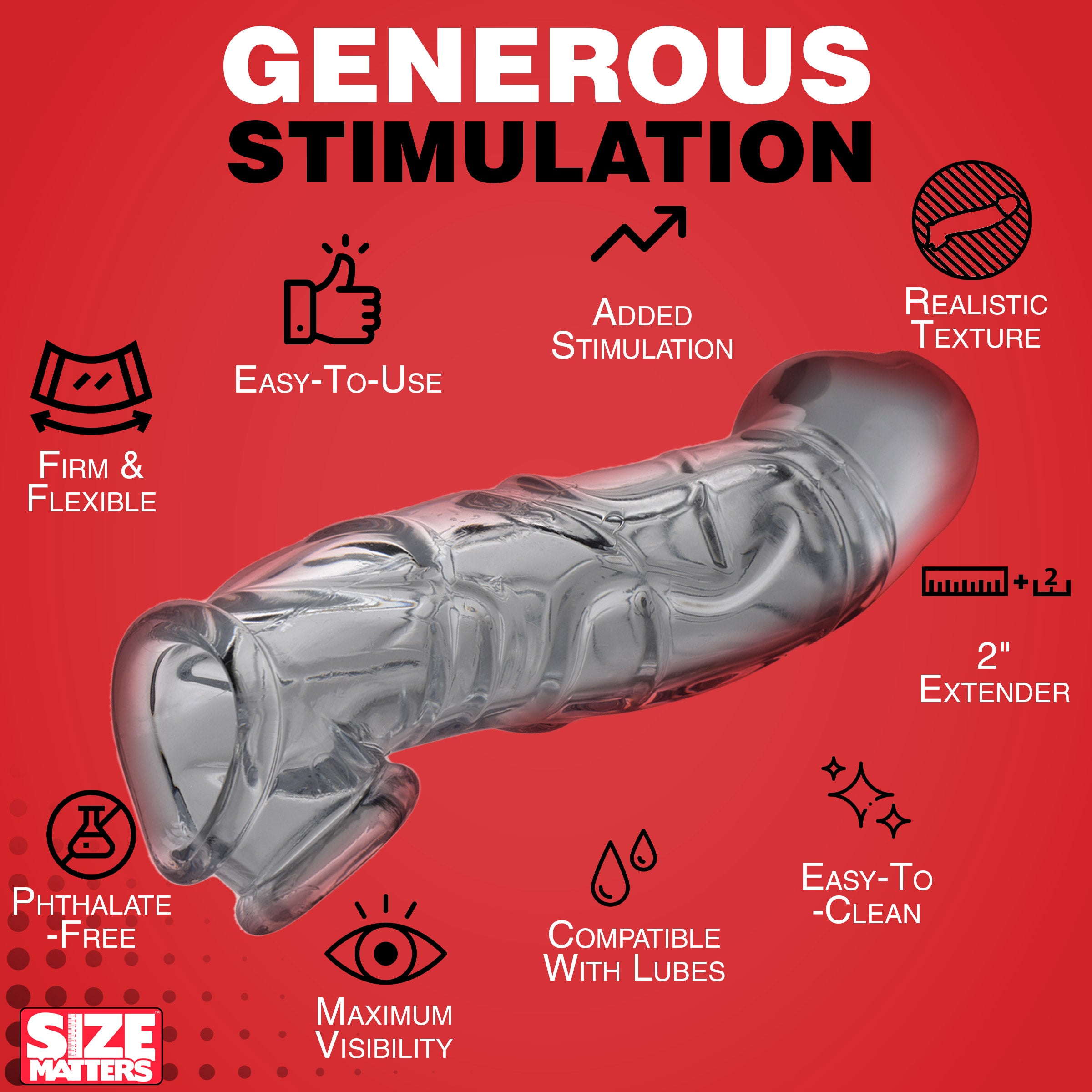 This extender sleeve gives you two whole inches of solid penis to plow into your partner! The realistic texture, featuring a bulbous head and bulging veins, along with a subtle curved shape will deliver a new kind of internal massage. Just lube up and put your entire package through the first hole, allowing your scrotum to go through the bottom hole for a satisfying stretch. The solid 2 inch tip is followed by a hollow interior that allows for a snug and secure fit. This body-safe and phthalate-free material is compatible with silicone and water-based lubricants. Use warm water and mild soap or a toy cleaner to clean after use.