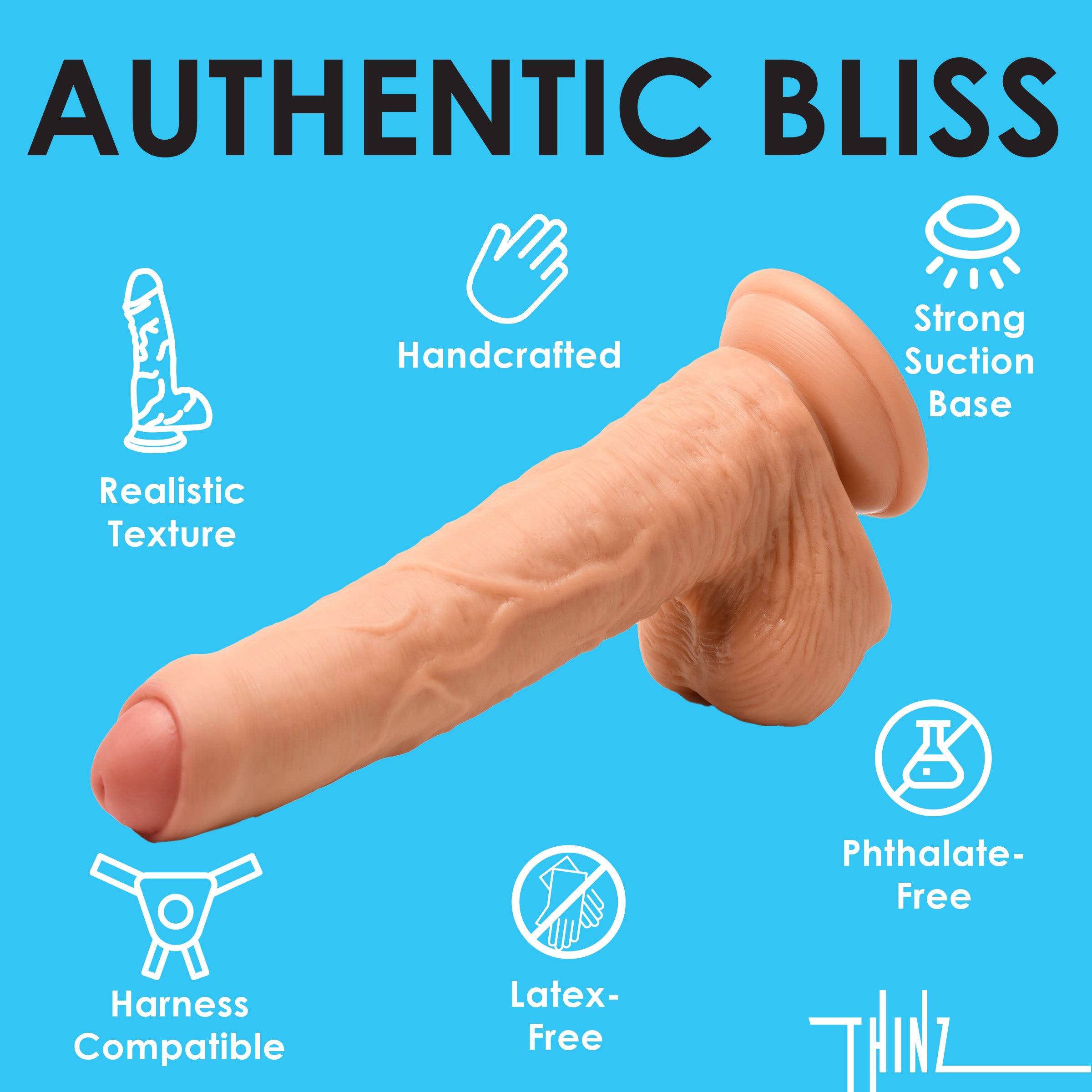 Do you love a man with a long, uncut dong? This dildo celebrates those who have a turtleneck around the head. Hand painted to look excellent up close so you can live out your fantasies without distraction, it is made out of super soft, stretchy and flexible TPE rubber. The skin at the tip folds over the corona of the head, is veiny along the shaft, and slim. At the base are wrinkled balls to bounce on when riding it. Enjoy it hands-free by pressing the super strong suction-cup onto any flat surface. Enjoy the extra length and see how deep you can get it! Invite your partner to play, too! This dong is strapon harness compatible for couples play and pegging. To wash, use warm water and mild soap then rinse and spray with a toy cleaner. Keep out of direct sunlight and away from heat. Use only with water-based lubricants.