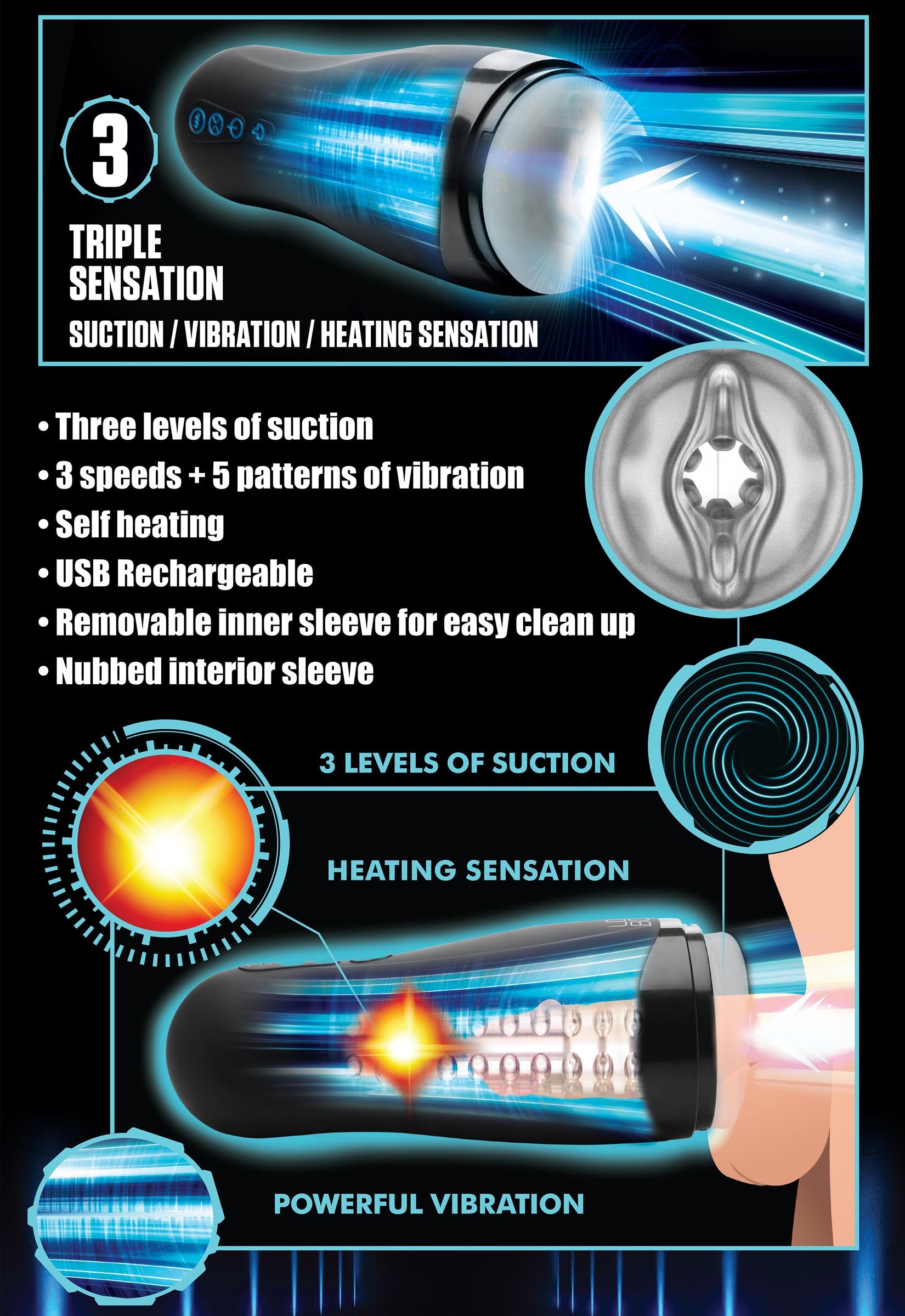Let this sucking masturbator do the work for you! Enjoy choosing from 3 speeds and 5 patterns of vibration, 3 squeezing modes and an added heating function for a sensual and satisfying session.